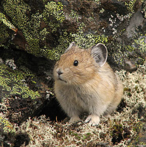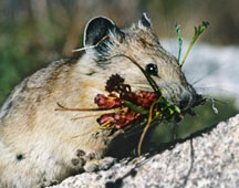 The American Pika is considered an indicator species for detecting ecological efforts of climate change. Pikas live above the tree line in boulder fields surrounded by meadows on mountain peaks. Although they thrive in colder temperatures, they avoid the summer heat by seeking the cool crevices under the boulders and by remaining inactive during warm periods. Despite the long, cold, snowy winters at high elevations, pikas do not hibernate. Pikas spend summers industriously gathering flowers and grasses and store them in "haypiles" for food to sustain them through the long winters. These "boulder bunnies," which weigh only a third of a pound, must collect more than 60 pounds of vegetation to survive the winter.